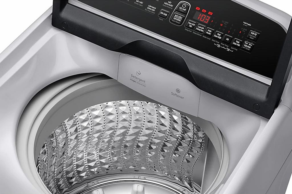 Hộp đánh tan bột giặt Magic Dispenser trên máy giặt Samsung có một cánh quạt xoay, kết hợp với tia nước mạnh mẽ, sẽ đánh tan bột giặt trước khi theo dòng nước đi vào lồng giặt. Như vậy sẽ không còn tình trạng cặn bột giặt bám lại trên quần áo, quần áo của bạn được giặt sạch sẽ tinh tươm.