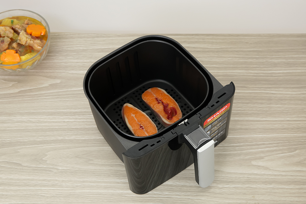 Chiếc nồi chiên không dầu Sharp này có dung tích sử dụng lên đến 5.5 lít vô cùng tiện lợi. bạn có thể nướng được dưới 1.5kg thịt, cá, sườn, gà.....